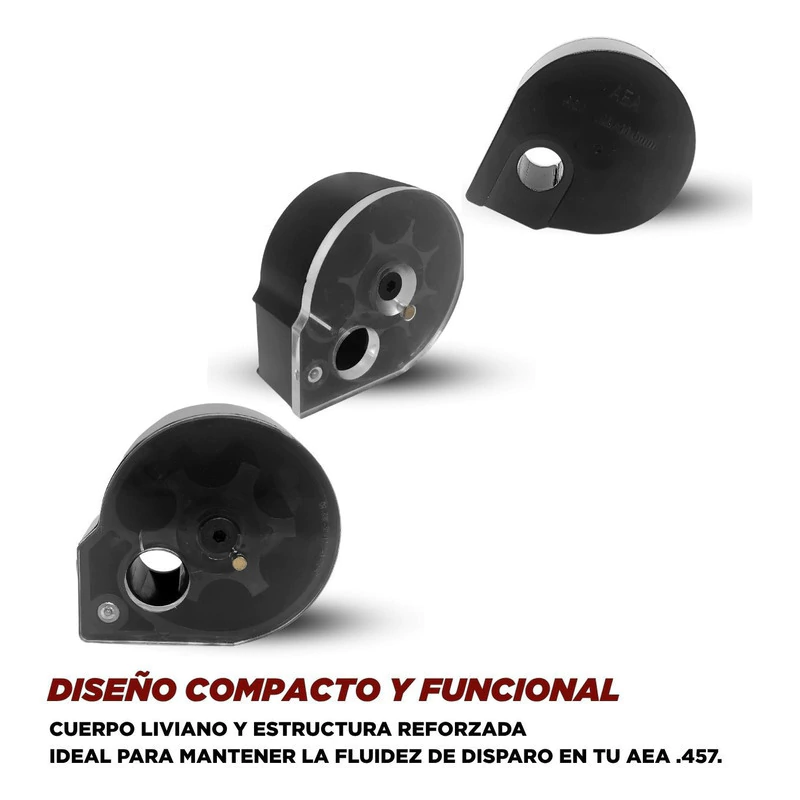 Aprovecha la capacidad de este cargador para concentrarte en la precisión y el disfrute de cada tiro. Con un diseño que permite una carga rápida y segura, optimiza tu tiempo y mantén la concentración en tu actividad favorita. Mejora tu experiencia de tiro y lleva tus habilidades al siguiente nivel con el cargador rotativo AEA Challenger .457.