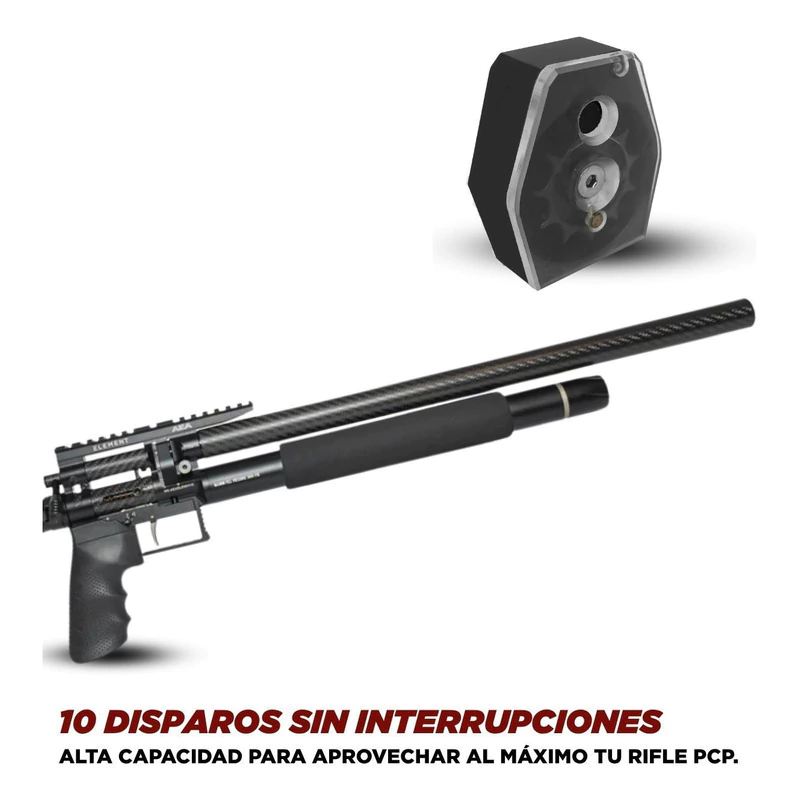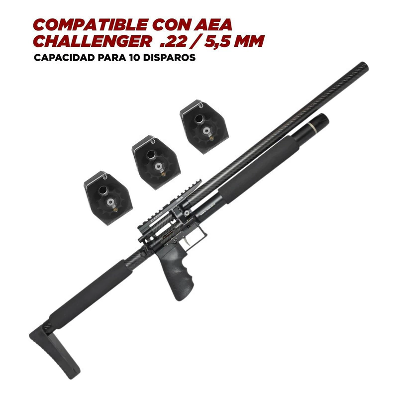 El Cargador Rifles PCP AEA Element Cal 5,5 mm .22 es la opción perfecta para los entusiastas de la caza y el tiro de precisión que buscan un rendimiento eficiente y confiable. Diseñado para el modelo Challenger .22, este cargador rotativo tiene una capacidad de 10 disparos, permitiendo una experiencia de uso fluida y continua.