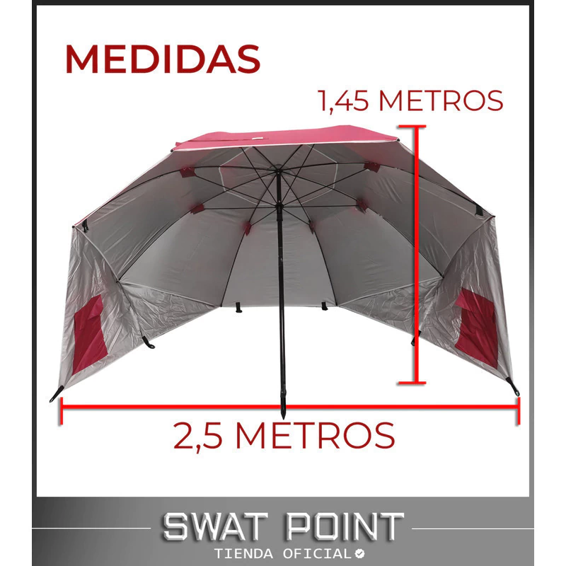 La sombrilla con paraviento SWAT ofrece una excelente protección contra el sol y el viento, gracias a su estructura de poliéster resistente y varillas de aluminio ligero. Con un diámetro de 2,5 metros, esta sombrilla brinda un amplio espacio para 3 a 4 personas. Además, incluye estacas de sujeción para asegurarla en cualquier terreno y un práctico bolso de transporte para llevarla fácilmente a todos tus destinos.