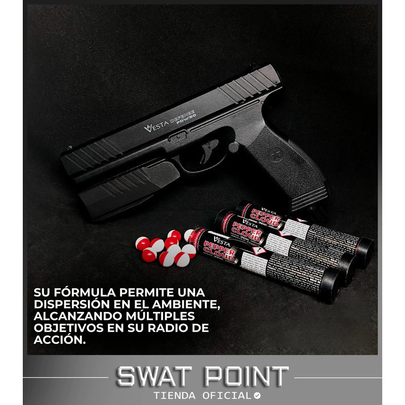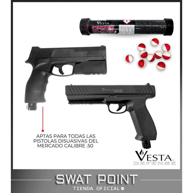 Las postas Vesta Quick Silver combinan un núcleo de acero con un recubrimiento de polímero ABS, logrando máxima potencia de impacto con gran velocidad y estabilidad. Por otro lado, las postas Vesta Pepper Cloud contienen una concentración de Capsicum al 5 % (OC) + PAVA, proporcionando un efecto disuasivo inmediato. Ambas opciones han sido diseñadas para ser compatibles con todas las pistolas disuasivas calibre .50.