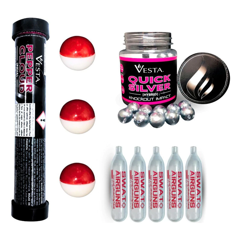 Este combo reúne dos tipos de postas diseñadas para situaciones de defensa personal y disuasión efectiva, asegurando versatilidad y alto rendimiento. Incluye postas de pimienta Vesta Pepper Cloud y postas híbridas de acero Quick Silver, además de 5 garrafas de CO2 de 12 g para garantizar un óptimo funcionamiento en cada disparo.