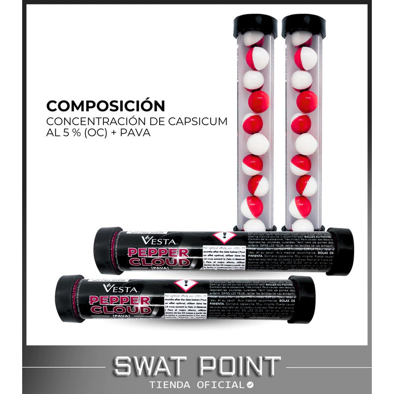 Las postas de goma Vesta Defense son una alternativa menos letal, fabricadas con goma de alta densidad (098 HA) para garantizar impacto efectivo y larga distancia. En paralelo, las postas de pimienta Vesta Pepper Clouds contienen una concentración de Capsicum al 5 % (OC) + PAVA, generando un potente efecto disuasivo inmediato. Ambas opciones son compatibles con todas las pistolas disuasivas calibre .50.