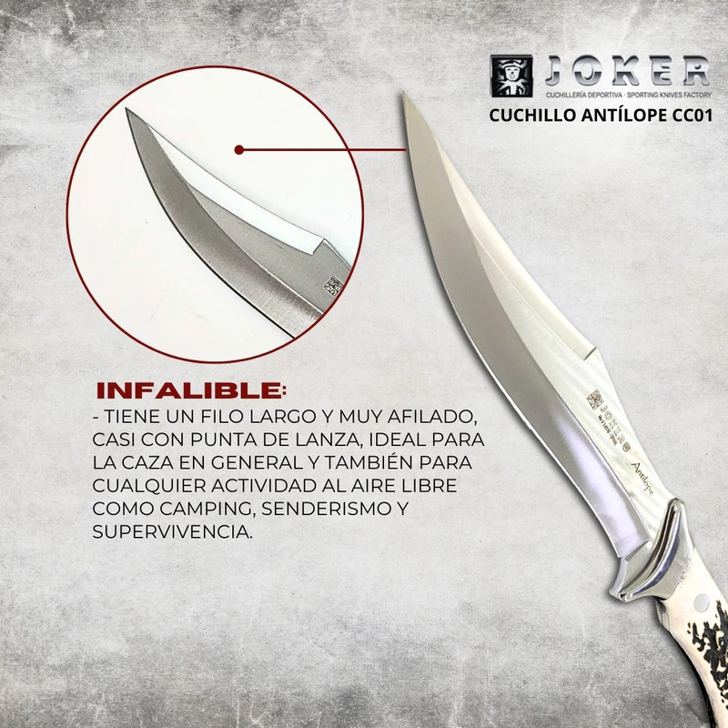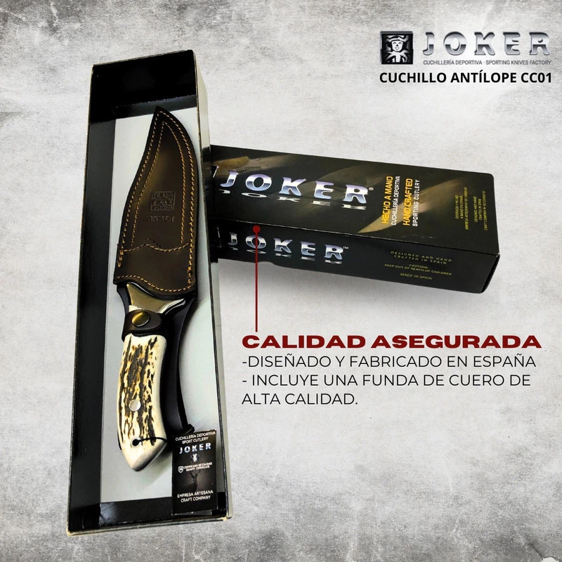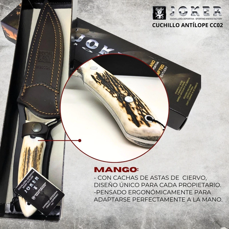 El mango de ciervo es único para cada propietario exigente y está diseñado ergonómicamente para adaptarse perfectamente a su mano. Como con todos los cuchillos Joker, el Antílope viene acompañado con una funda de cuero de alta calidad y de color marrón.