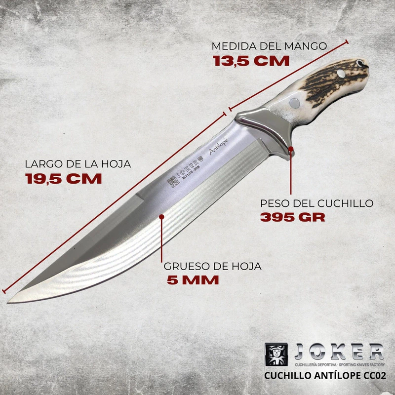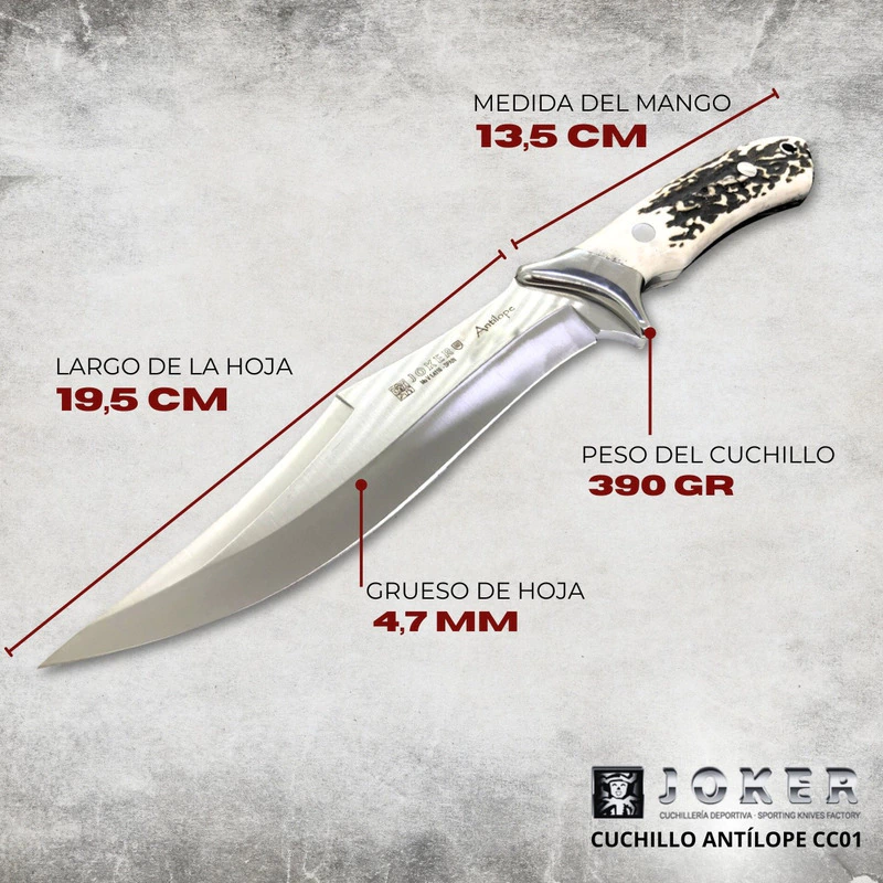 Los Cuchillos Joker línea Antílope, con cachas de asta de ciervo y una hoja curva de 19,5 cm. son perfecto para actividades al aire libre como pesca, caza y senderismo.