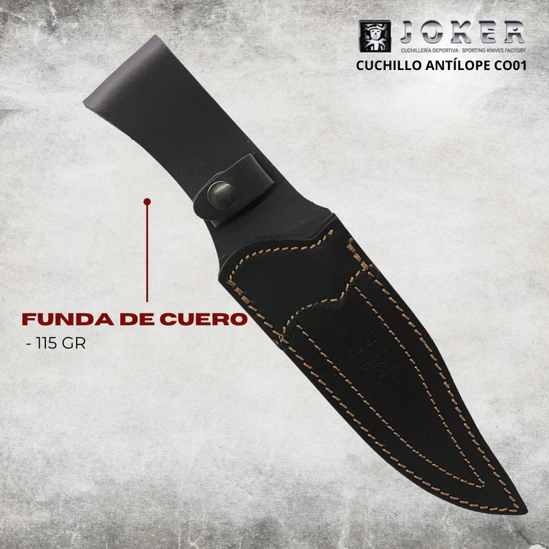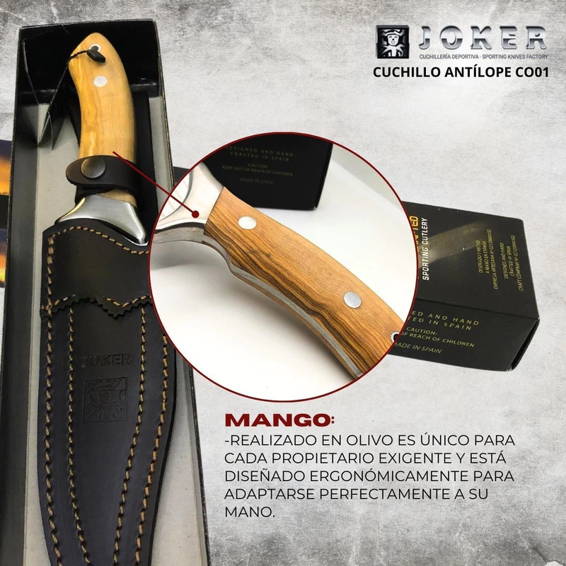 El mango de olivo es único para cada propietario exigente y está diseñado ergonómicamente para adaptarse perfectamente a su mano. Como con todos los cuchillos Joker, el Antílope viene acompañado con una funda de cuero de alta calidad y de color marrón.
