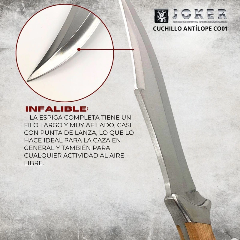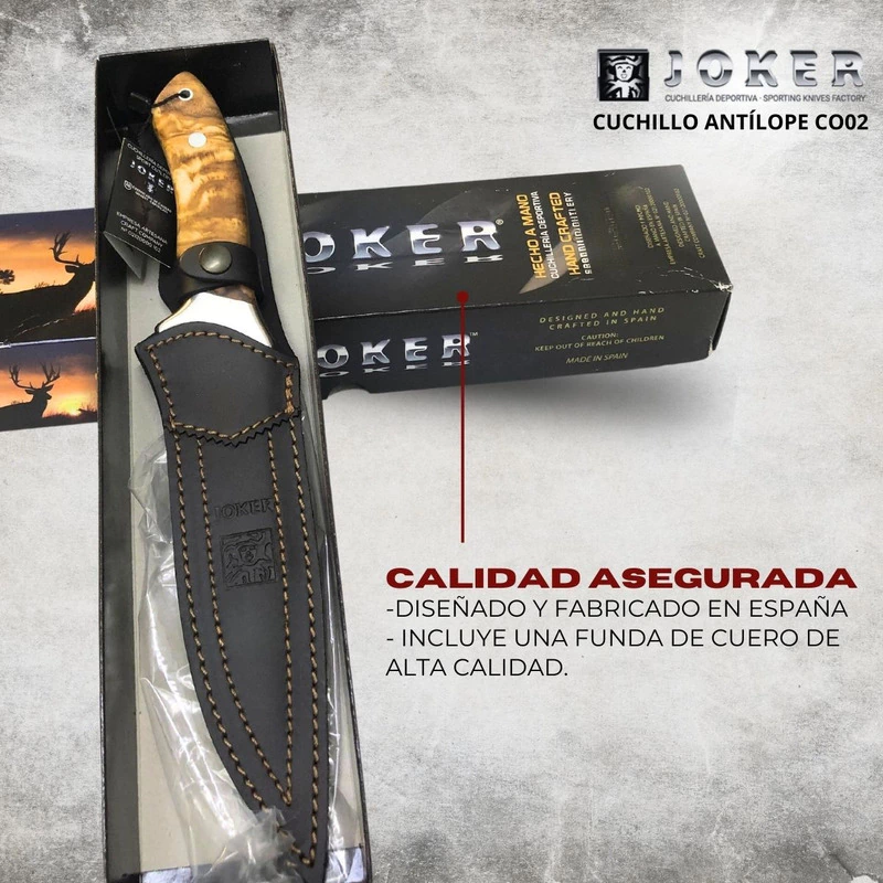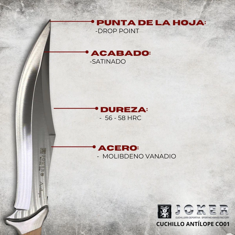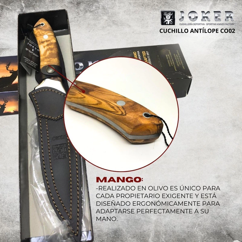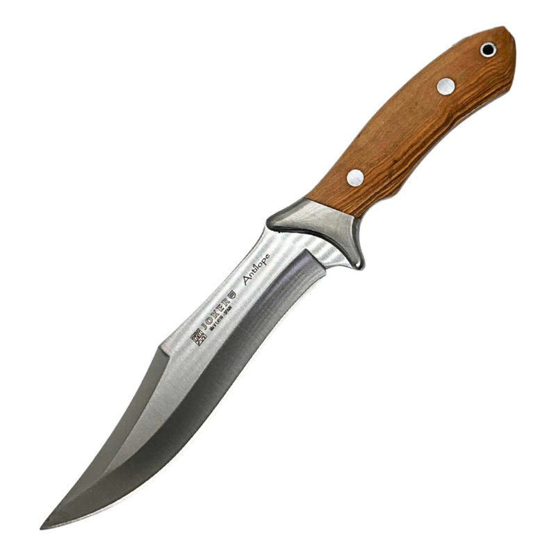 Los Cuchillos Joker línea Antílope, con mango de olivo y una hoja curva de 19,5 cm. son perfecto para actividades al aire libre como pesca, caza y senderismo.
