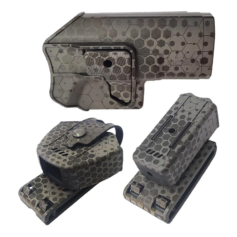 Es un combo versátil y funcional diseñado para transportar de manera segura una pistola Glock, un porta cargador y unas esposas. Está fabricada con materiales duraderos y cuenta con un sistema de retención seguro. Es ideal para uso táctico, fuerzas de seguridad o actividades al aire libre.