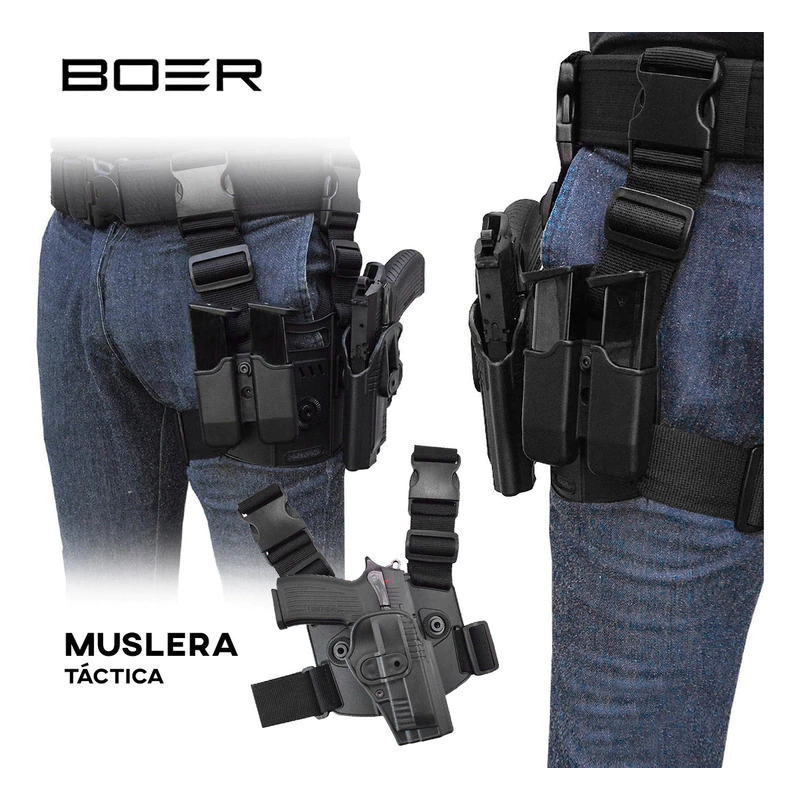 Son accesorios diseñados para brindar comodidad y funcionalidad a profesionales de seguridad y aplicación de la ley. Esta funda cuenta con un diseño que permite llevar la pistola de forma segura y de fácil acceso, al tiempo que ofrece, en combo, un porta cargador doble. Además, la muslera incluída de dos tiras proporciona un ajuste seguro y cómodo alrededor de la pierna, asegurando que la funda se mantenga en su lugar durante movimientos rápidos y exigentes. Fabricada con materiales duraderos y de alta calidad, esta funda ofrece una sujeción confiable y versátil en diversas situaciones tácticas y profesionales.