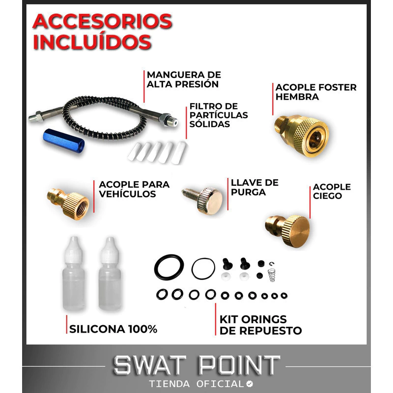 El SWAT AIRGUNS SA-310 viene equipado con un kit de reparación completo que incluye siliconas, O-rings y otros accesorios esenciales, lo que permite un mantenimiento sencillo y prolonga su vida útil. Combinando un diseño robusto en acero inoxidable con tecnología avanzada, este inflador ha sido diseñado para ofrecer una experiencia inigualable en el llenado de armas PCP.