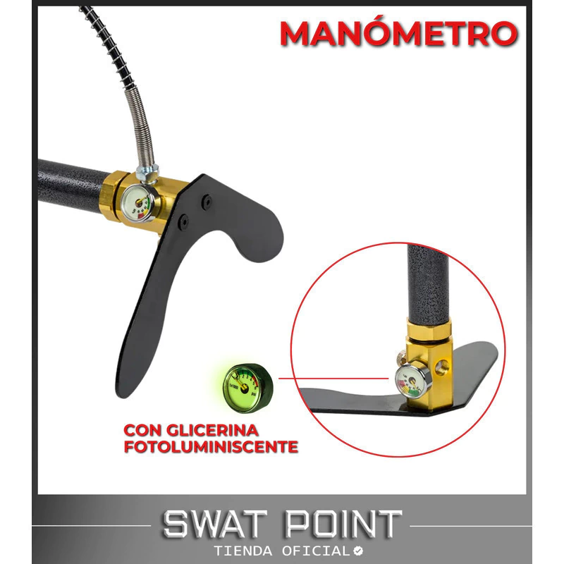 El Inflador PCP SWAT AIRGUNS SA-310 es una herramienta de última generación, diseñada con materiales de alta calidad que soportan mejor la fricción y el desgaste, garantizando mayor durabilidad. Este modelo ha sido rigurosamente testeado por nuestro equipo técnico, asegurando un rendimiento superior en comparación con otros infladores del mercado. Su capacidad para alcanzar hasta 4.500 psi/310 bar lo hace ideal para cargar armas PCP con precisión y eficiencia, cumpliendo con las exigencias de los usuarios más experimentados.