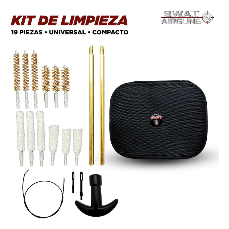 El Kit de Limpieza Swat Airguns (GPGC-A19B) es la solución práctica y completa para mantener tus equipos siempre en óptimas condiciones. Diseñado con materiales de calidad, incluye cepillos de bronce, mopas de algodón y accesorios esenciales para una limpieza eficiente y duradera.