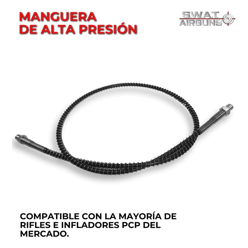 Diseñada para el inflado de rifles PCP, esta manguera es práctica y fácil de usar, permitiendo a los usuarios concentrarse en lo que realmente importa: su precisión y rendimiento en el campo.