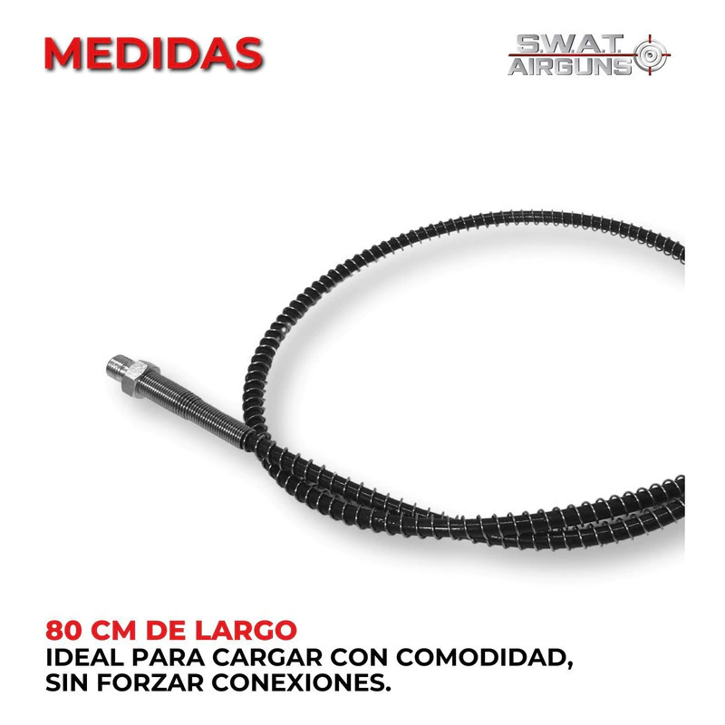 La Manguera Inflador PCP de 80 cm de Swat Airguns es la herramienta ideal para quienes buscan una solución efectiva y portátil para inflar rifles PCP. Su diseño especializado permite alcanzar presiones de hasta 300 bar, asegurando un inflado rápido y eficiente, crucial para un rendimiento óptimo del rifle.