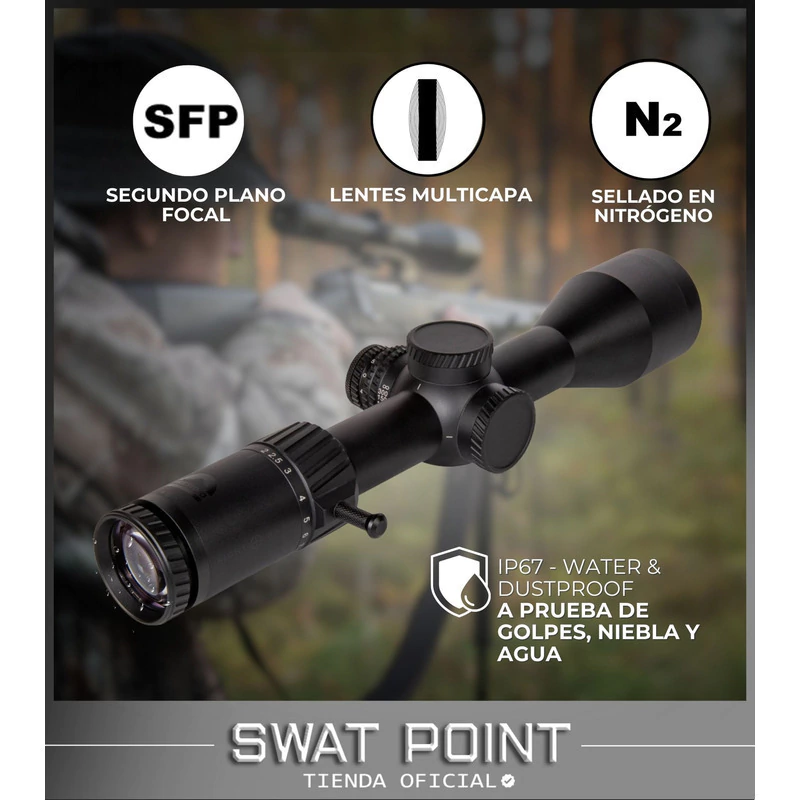 Fabricada en una sola pieza de aluminio de grado aeronáutico, esta mira cuenta con un cuerpo resistente y duradero, preparado para enfrentar el uso intensivo al aire libre. Sus torretas táctiles, de bajo perfil y con tapas, brindan clics audibles y una textura que permite ajustes rápidos y seguros. Además, incluye tope de cero incorporado, lo que facilita volver al punto de partida luego de calibrar. Su construcción a prueba de golpes, agua y polvo (certificación IP67) la convierte en una aliada confiable bajo cualquier clima o entorno.