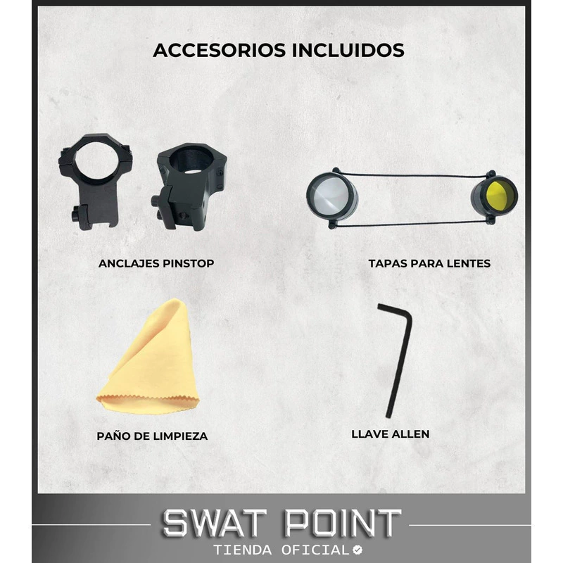 La mira incluye anclajes con pinstop, tapas para lentes, una llave allen, y un paño de limpieza para mantenerla en perfectas condiciones. Con su regulación manual de alza y deriva, nitidez ajustable y una regulación de 1/4 100 YDS por click, te ofrece una personalización total para mejorar la precisión en cada disparo.