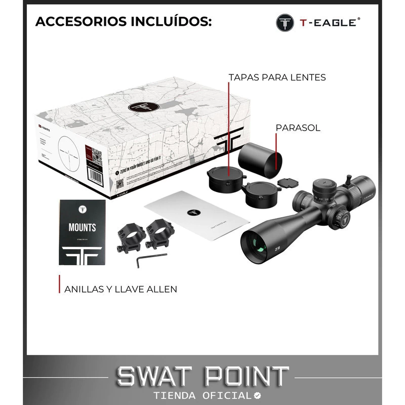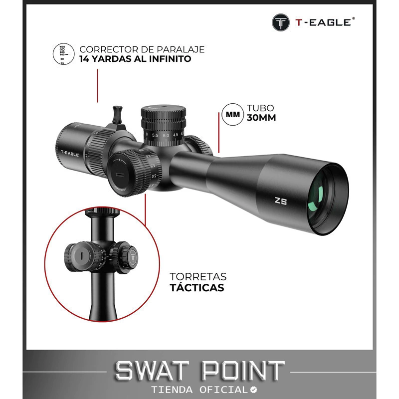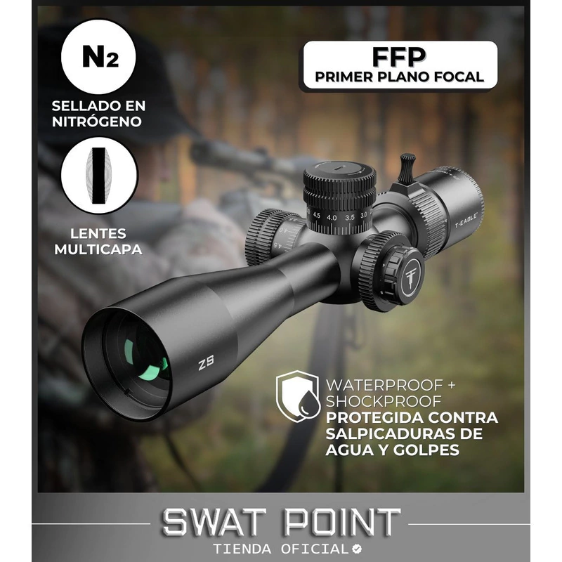 La Mira Telescópica T-eagle ZS 4-16X44 FFP está diseñada para quienes buscan precisión y versatilidad en sus actividades de tiro o caza. Con un rango de aumento de 4X a 16X, esta mira ofrece una visión nítida y detallada, adaptándose a diversas distancias con facilidad. Su plano focal FFP (First Focal Plane) permite que la retícula se ajuste proporcionalmente al zoom, asegurando cálculos de distancia precisos sin importar la magnificación.