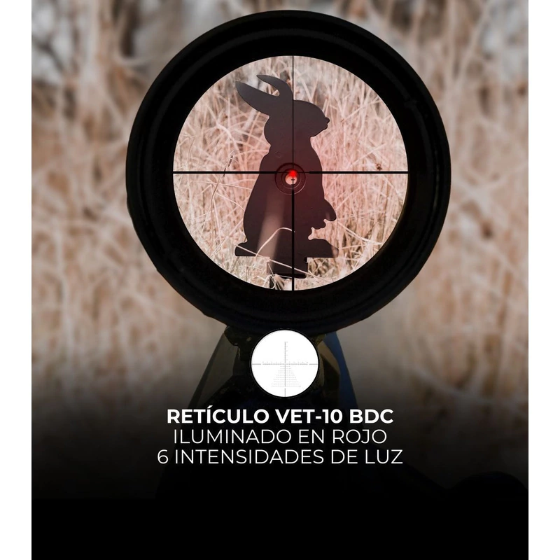 Equipada con lentes SCHOTT HT alemanes, junto a la tecnología LaREE HD y recubrimiento multicapa VePRO FMC, alcanza hasta un 90% de transmisión de luz, ofreciendo imágenes brillantes, nítidas y con colores reales incluso en condiciones de baja luminosidad. Además, incorpora iluminación central en 6 niveles para adaptarse a distintos escenarios de caza.