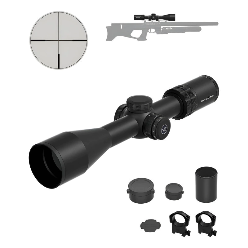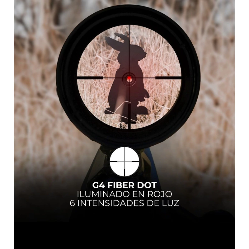 Equipada con retículo German #4 iluminado con punto de fibra, asegura una visibilidad óptima incluso bajo la luz solar más intensa, siendo ideal para la caza de animales pequeños. Sus torretas tapadas previenen ajustes accidentales, mientras que los clics de 1/10 MIL permiten una regulación precisa de la elevación y la deriva.