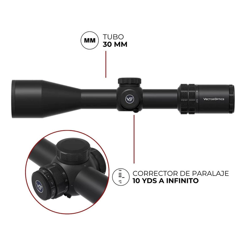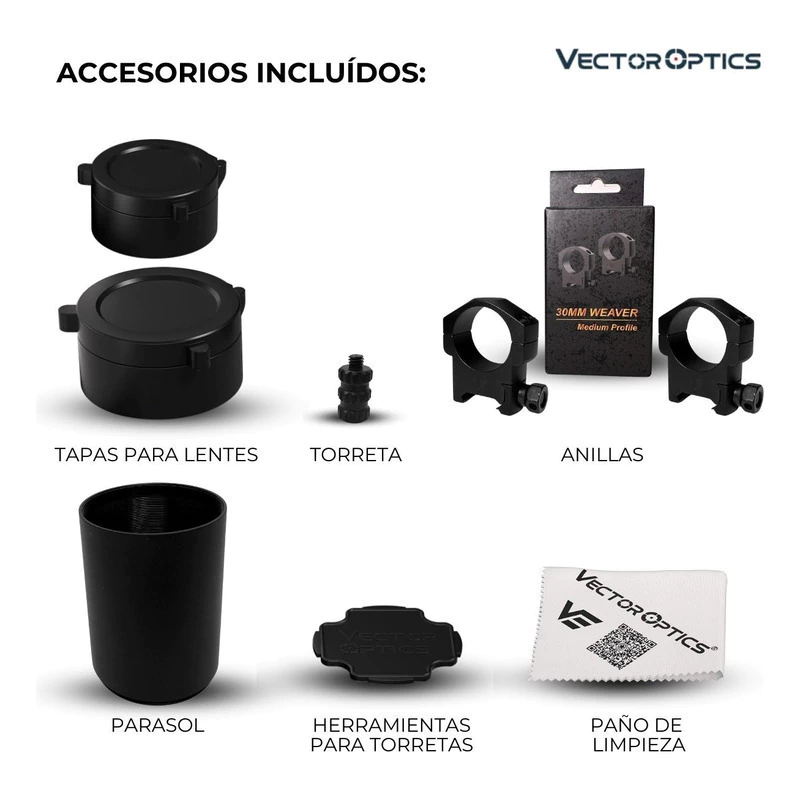 o Incluye: Palanca de zoom, manual, parasol, paño de limpieza y anillas Weaver 30 mm.