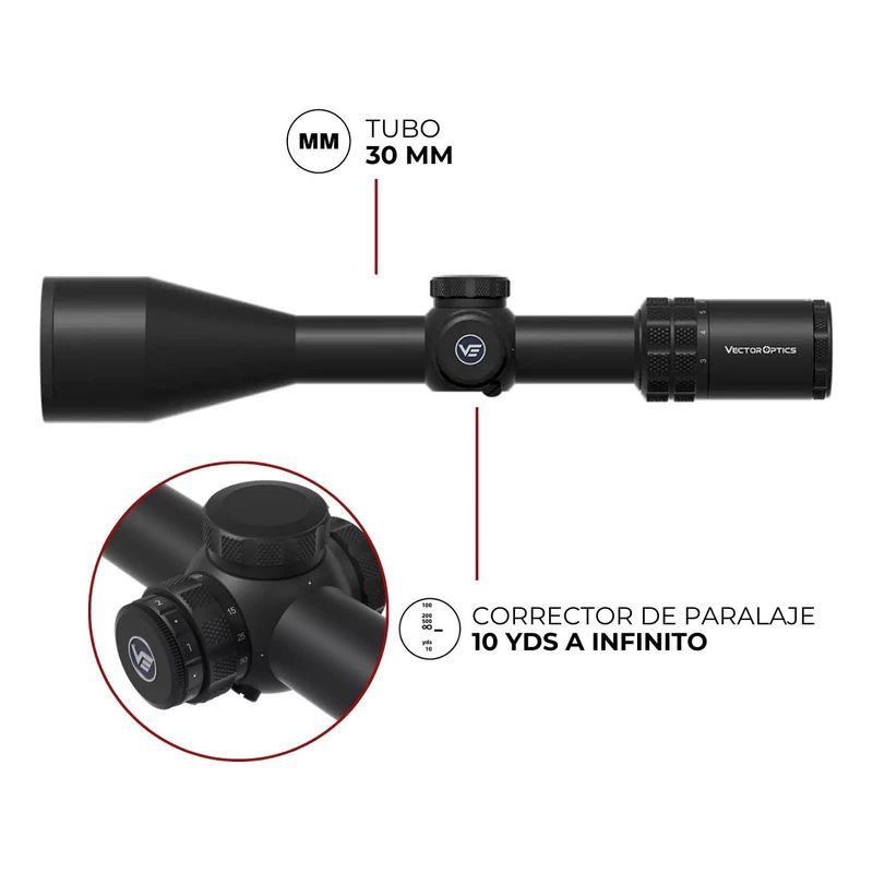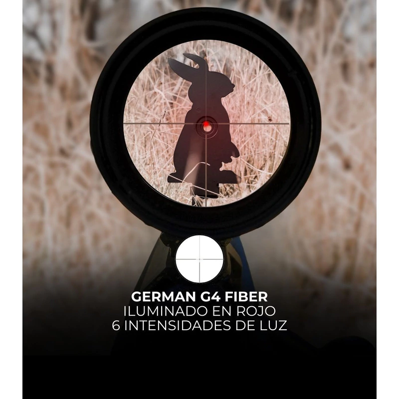 Equipada con el retículo German #4 con punto de fibra iluminado, asegura una visibilidad sobresaliente del centro incluso bajo luz solar intensa. Además, cuenta con enfoque lateral desde los 10 yardas hasta infinito, lo que la hace ideal para la caza, tiros de precisión y escenarios cambiantes.