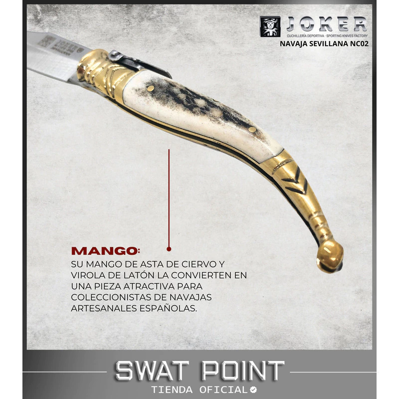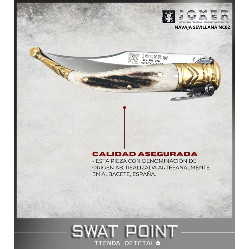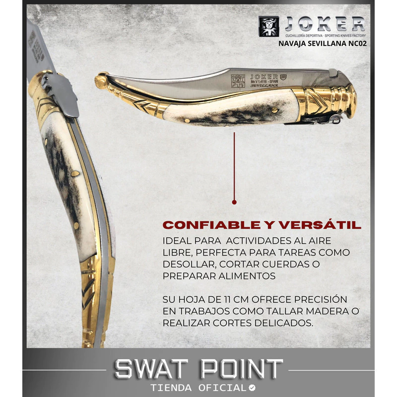 La Navaja Sevillana Joker es una obra de artesanía clásica diseñada para quienes valoran la funcionalidad y el estilo en sus herramientas. Fabricada en Albacete, España, esta pieza combina tradición con calidad moderna, destacándose por su diseño atemporal y detalles cuidadosamente elaborados.