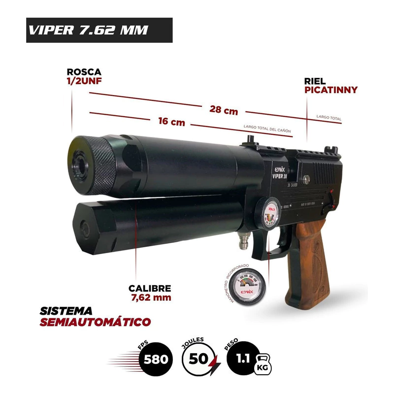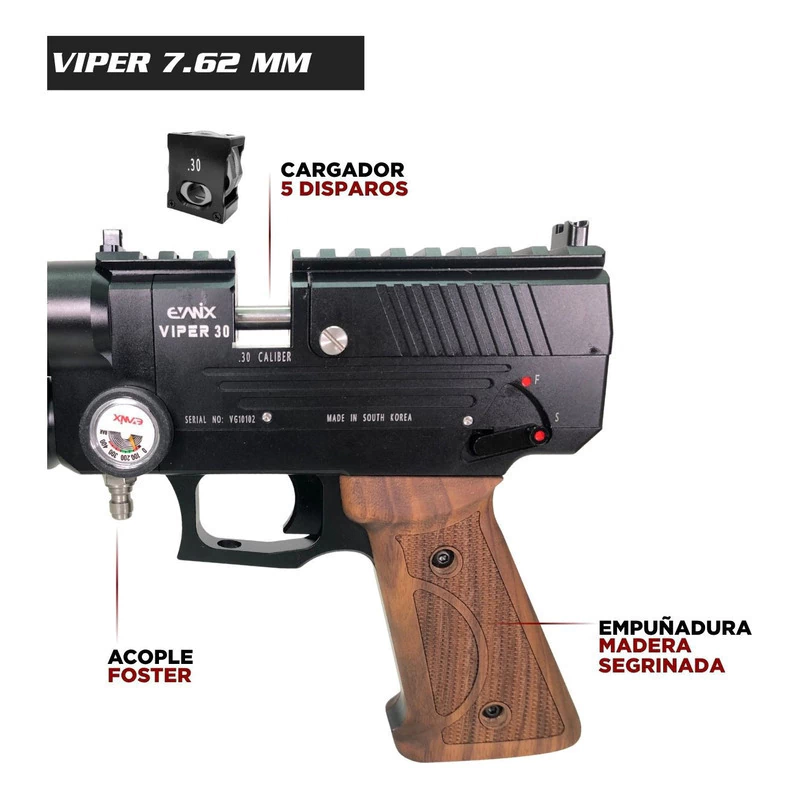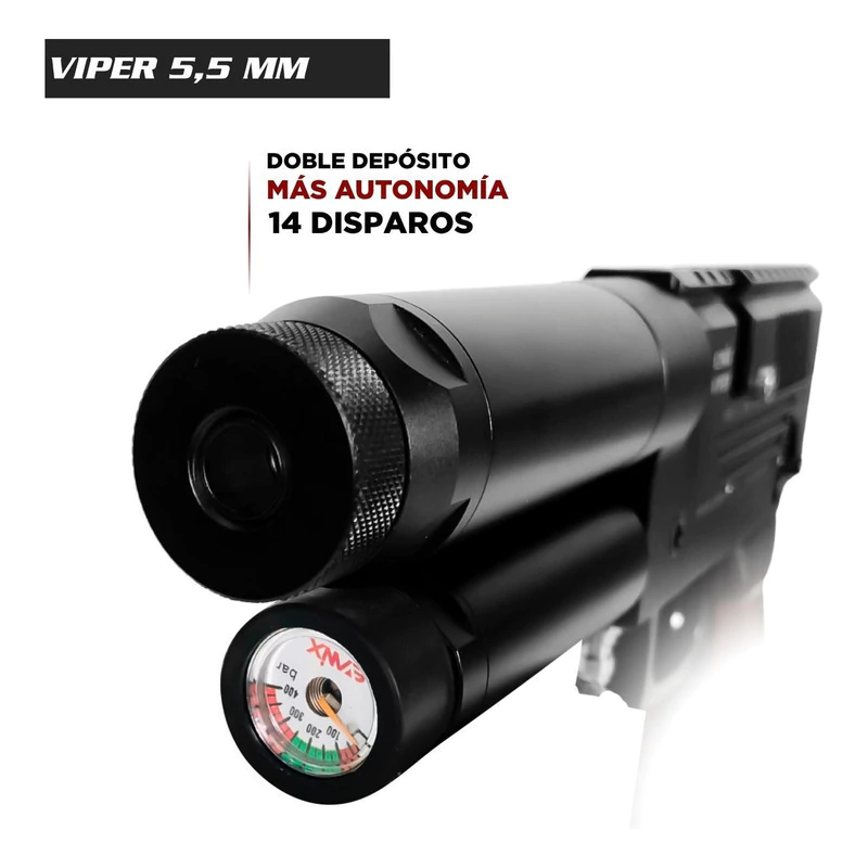 Potencia y Precisión: La Viper ofrece entre 12 y 16 disparos, dependiendo del calibre (.22 , .25 o .30), con una precisión excepcional. Su diseño inteligente permite montar ópticas en su riel Picatinny para un mayor control y puntería.