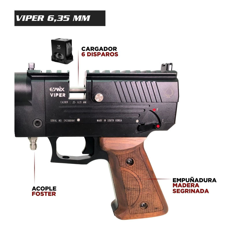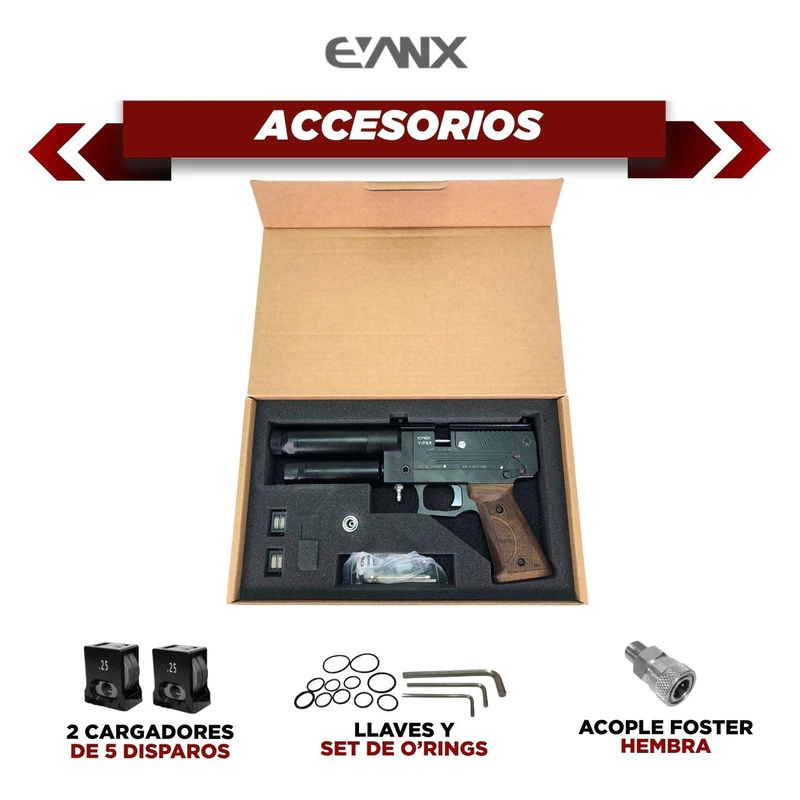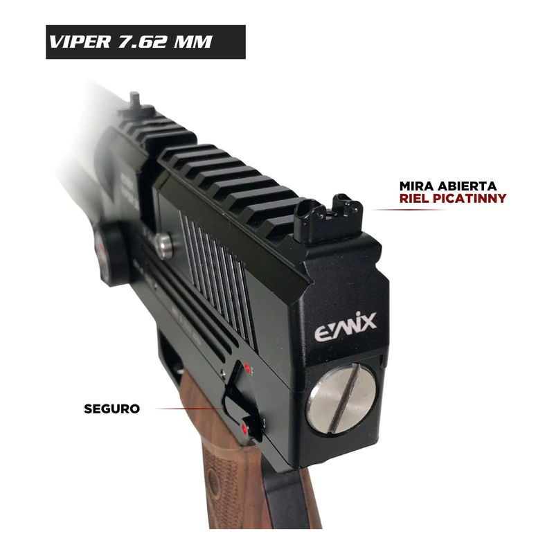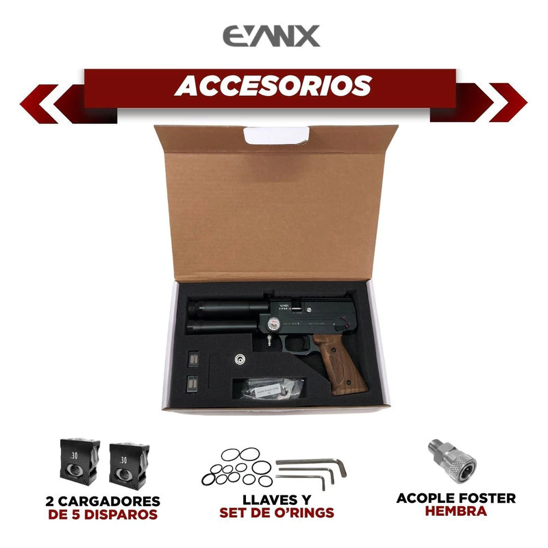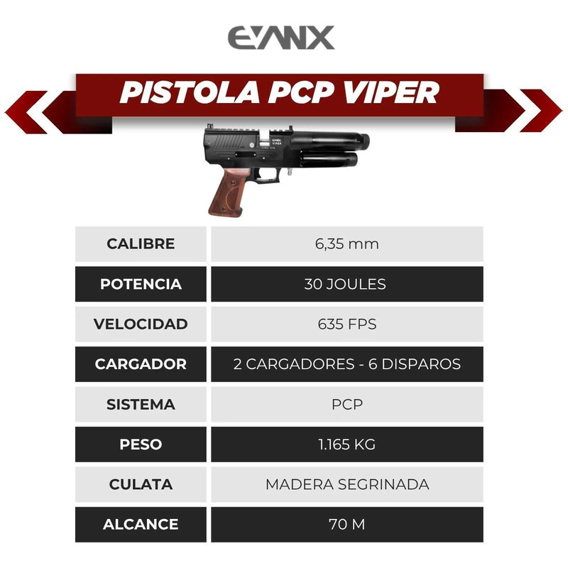 ¡Potencia, precisión y diseño excepcional se unen en la Pistola PCP Viper de Evanix! Fabricada bajo los más altos estándares de calidad, la Viper es una opción compacta y poderosa para los entusiastas del tiro deportivo.