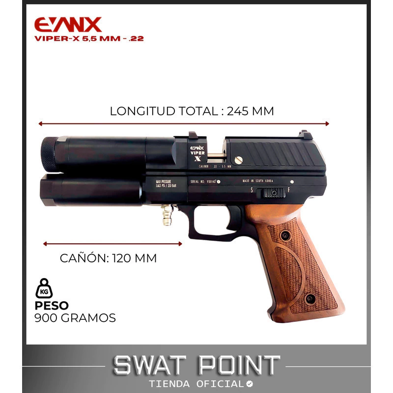 Con un sistema PCP de aire comprimido, la Viper-X ofrece una autonomía de 14 disparos por carga y una velocidad promedio de 650 FPS con munición de 16 grains, generando hasta 23 joules de energía. Su cañón de 120 mm incluye una rosca 1/2 UNF para agregar un supresor de sonido, mientras que su riel superior de 11 mm permite montar una mira o punto rojo para mayor versatilidad.