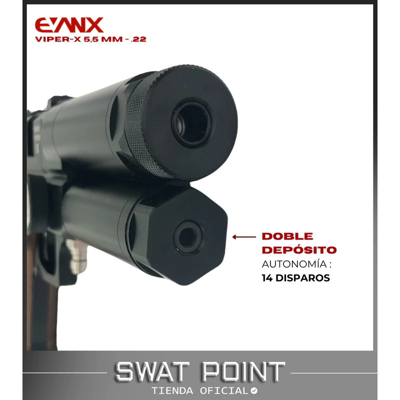 La Evanix Viper-X es la versión compacta y de alto rendimiento de la reconocida pistola PCP Viper. Diseñada para quienes buscan portabilidad sin sacrificar potencia, esta pistola semi automática combina innovación, precisión y facilidad de uso en un diseño ligero y ergonómico.