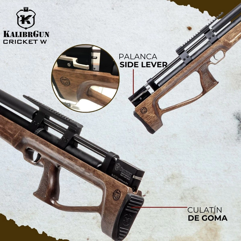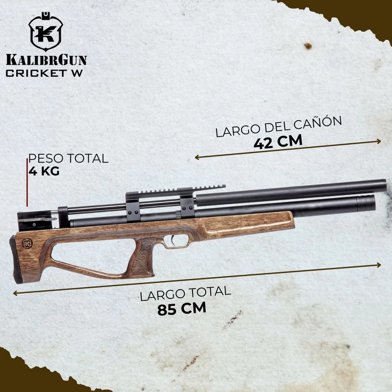 El Rifle Kalibrgun Cricket W es un PCP de alta precisión con un diseño bullpup, que permite reducir la longitud total del arma sin comprometer la longitud del cañón. Este rifle está diseñado para ofrecer un rendimiento superior, gracias a su depósito que ocupa casi toda la longitud del arma y está equipado con un manómetro para monitorear la presión.