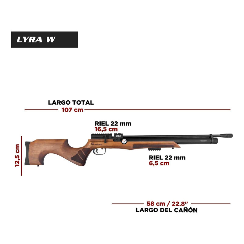 En rendimiento el Lyra destaca por una velocidad máxima de hasta 850 fps (aprox.) y una energía de salida cercana a 56 J, entregando impactos contundentes con buena retención de energía. Cuenta con cargador rotativos de 10 tiros, autonomía aproximada de 40 disparos por carga y gatillo regulable en altura para adaptar la sensación al tirador. Además incorpora riel Picatinny superior e inferior para montar miras, bipodes u otros accesorios y un cañón largo de 580 mm que ayuda a la estabilidad y agrupación.