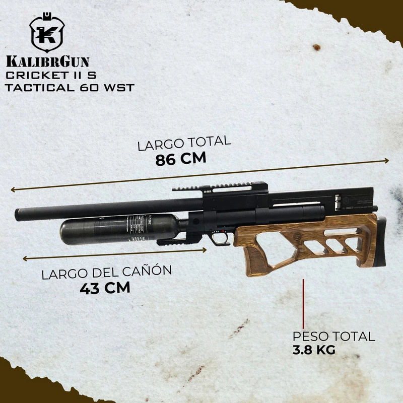 El Rifle PCP KALIBRGUN CRICKET II S TACTICAL 60 WST es la segunda generación del popular bullpup, ahora mejorado y perfeccionado para cumplir con las tendencias modernas y las exigencias de los clientes. Fabricado originalmente en Rusia y perfeccionado en la República Checa, este rifle es una verdadera obra maestra que combina precisión, potencia y diseño innovador.