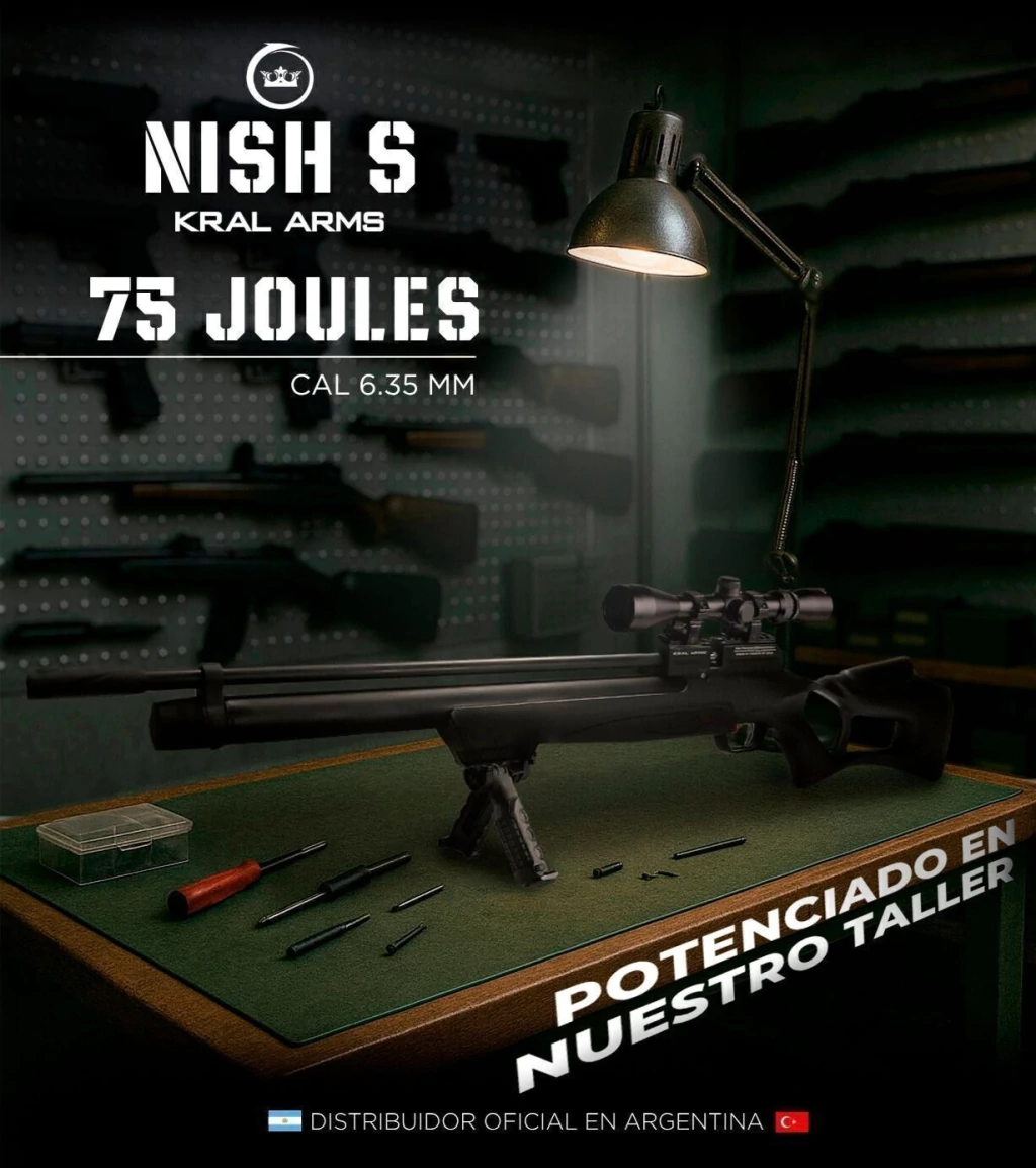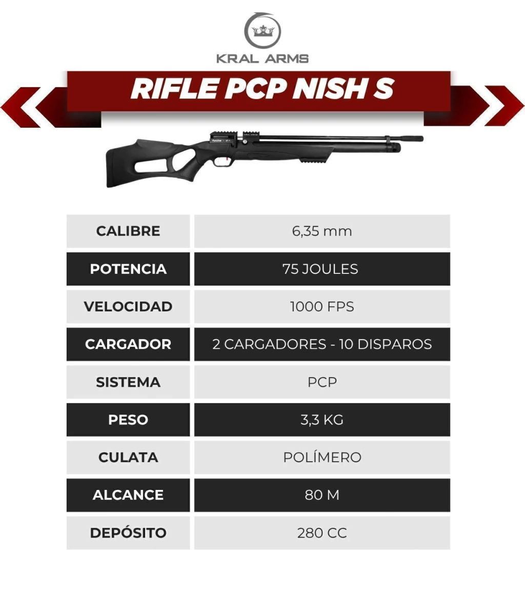 Este combo completo es la elección ideal para quienes buscan potencia, precisión y comodidad en el tiro deportivo. El Kral Puncher Nish en calibre 6,35 mm (.25) es un rifle PCP de alta autonomía, con capacidad para 10 disparos por carga, depósito de 280 cc y una velocidad de hasta 1000 fps (75 joules). Su diseño ergonómico con culata Thumbhole en polímero ABS lo hace ligero y fácil de maniobrar, mientras que su cañón microestriado de acero pavonado garantiza una precisión excepcional.