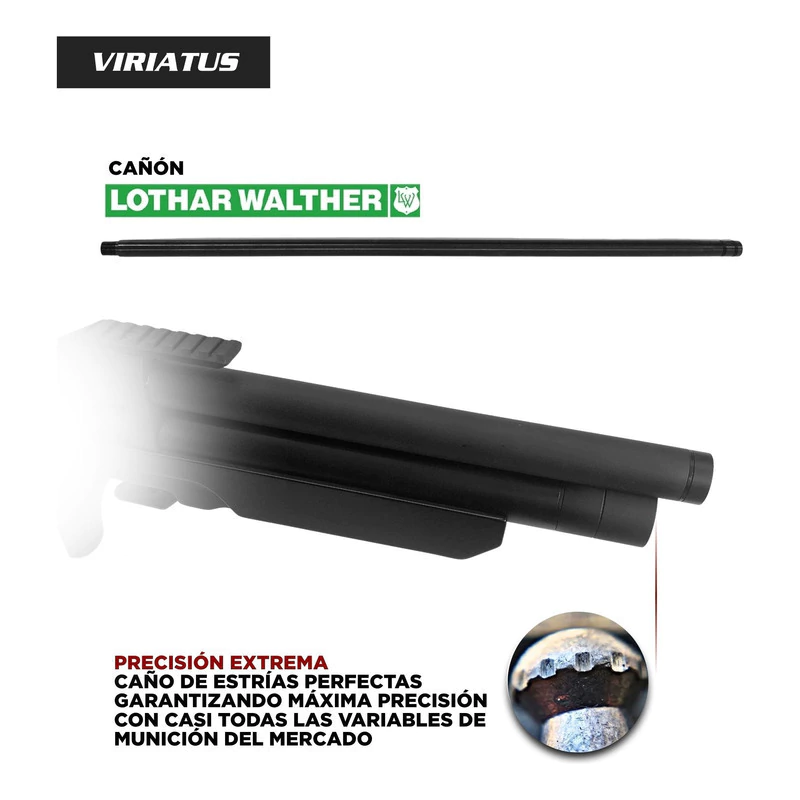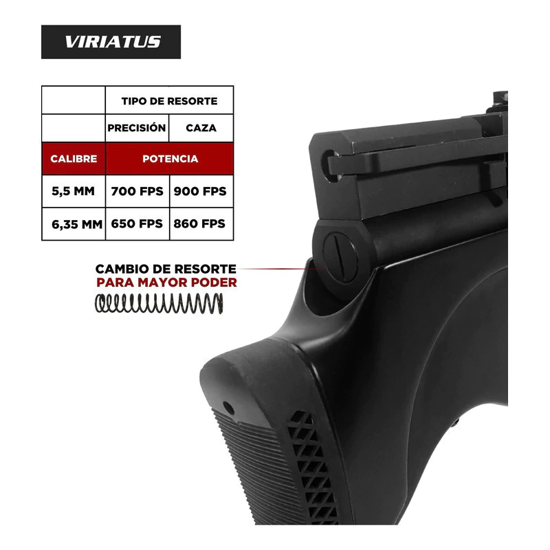 El Viriatus es una excelente arma tanto para caza, como para disparos de precisión. En tan sólo 3 simples pasos, podés transformarlo de media a gran potencia, mediante el reemplazo de un resorte (incluido).