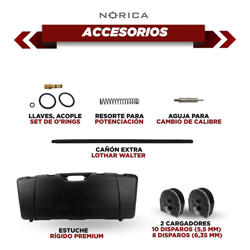 o Potencia: 700 / 900 FPS (5.5 mm - 16 gr) y 650 / 860 FPS (6.35 - 25 gr)