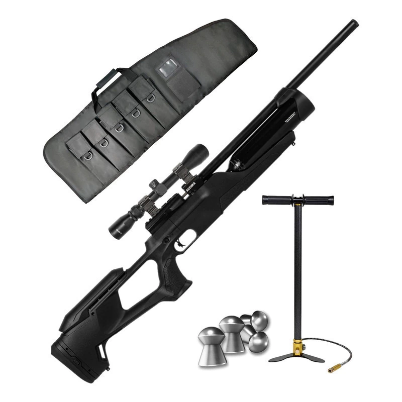 COMBO PCP REXIMEX ACCURA 6,35 MM + MIRA 3-9x40 SWAT AIRGUNS + BALINES + INFLADOR PCP SWAT AIRGUNS SA-310 + FUNDA SWAT AIRGUNS GRIS 105 CM 5 BOLSILLOS -