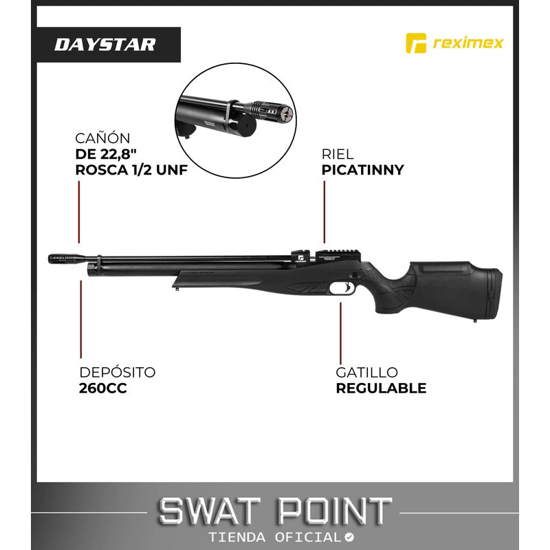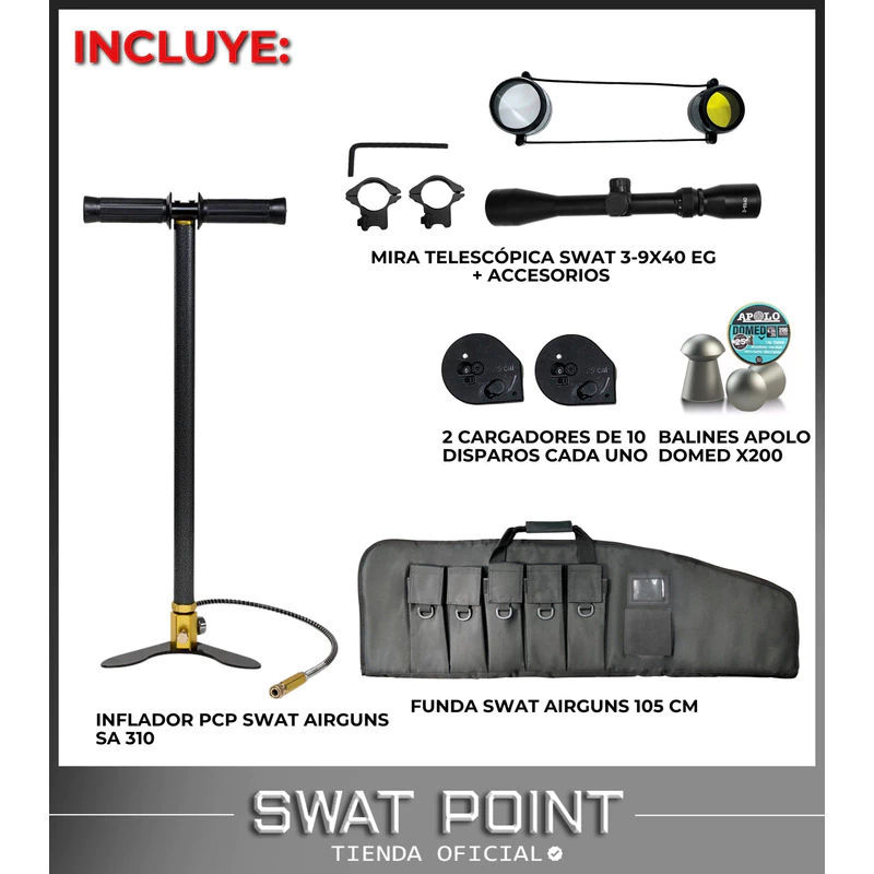 El Combo Rifle PCP REXIMEX DAYSTAR 6,35 MM m con mira telescópica SWAT 3-9x40, inflador SWAT SA 310 y funda es la combinación ideal para quienes buscan precisión, potencia y rendimiento superior.