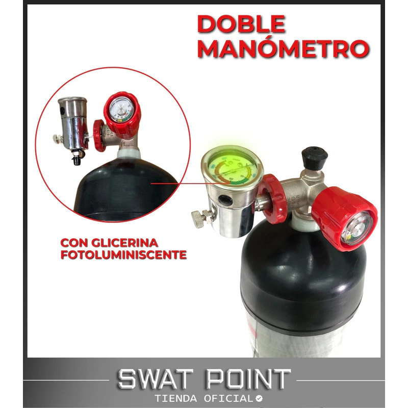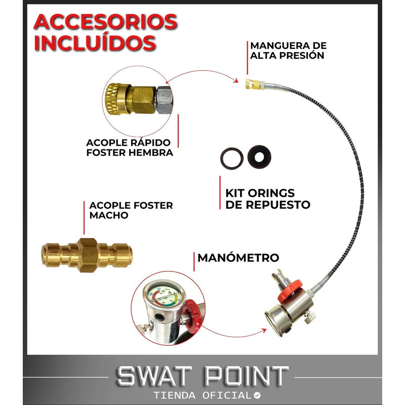 Además viene con estación de carga que cuenta con válvula de seguridad y manómetro incorporado fabricado en acero inoxidable.