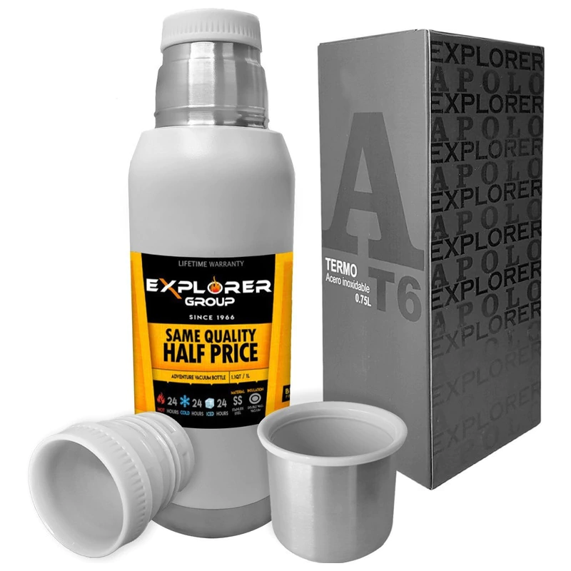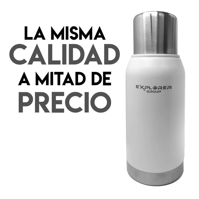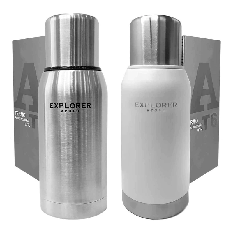 TERMO EXPLORER ACERO INOXIDABLE 750 ML COLOR BLANCO / PLATA CON TAPÓN CEBADOR IDEAL PARA MATE. CONSERVA 24 HS. FRÍO Y CALOR